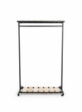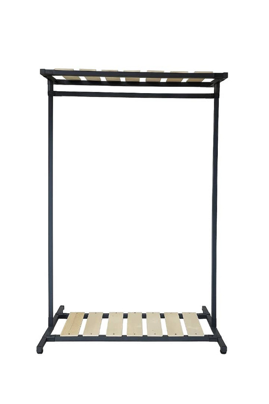 پروفیل ۲۵×۲۵ ضخیم در کنار تختههای چوبی پرداختشده، استحکام بالایی را برای تحمل وزن زیاد ارائه میدهد. در بخش بالا میتوان لباسهای بلند آویزان کرد و در قسمت پایین کفش یا کیف را قرار داد.