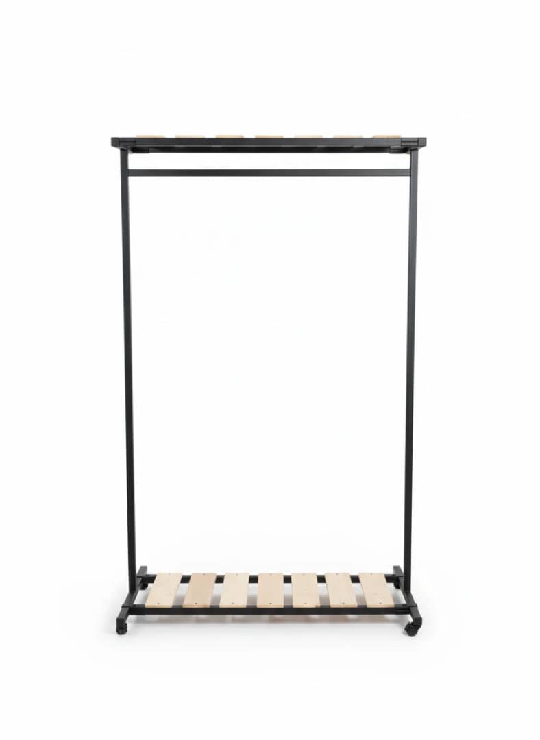 پروفیل ۲۵×۲۵ ضخیم در کنار تختههای چوبی پرداختشده، استحکام بالایی را برای تحمل وزن زیاد ارائه میدهد. در بخش بالا میتوان لباسهای بلند آویزان کرد و در قسمت پایین کفش یا کیف را قرار داد.