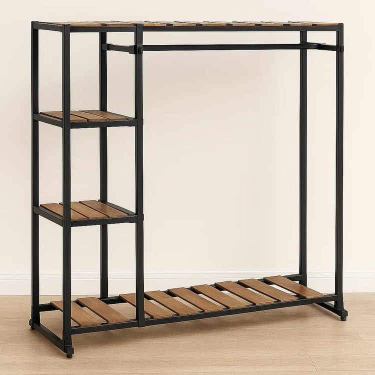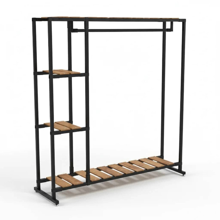 این رگال ترکیبی از اسکلت فلزی و طبقات چوبی مستحکم و مقاوم و ضد اب است که هم برای نمایش محصولات در فروشگاه ها و بوتیک ها ایده ال است و هم برای نظم دهی لباس و وسایل در خانه است.